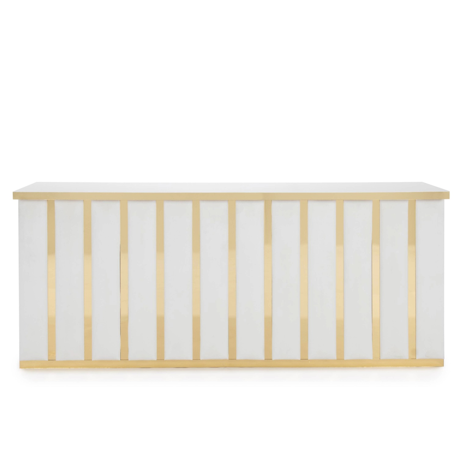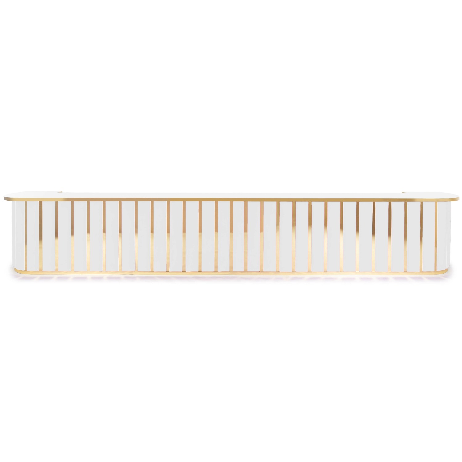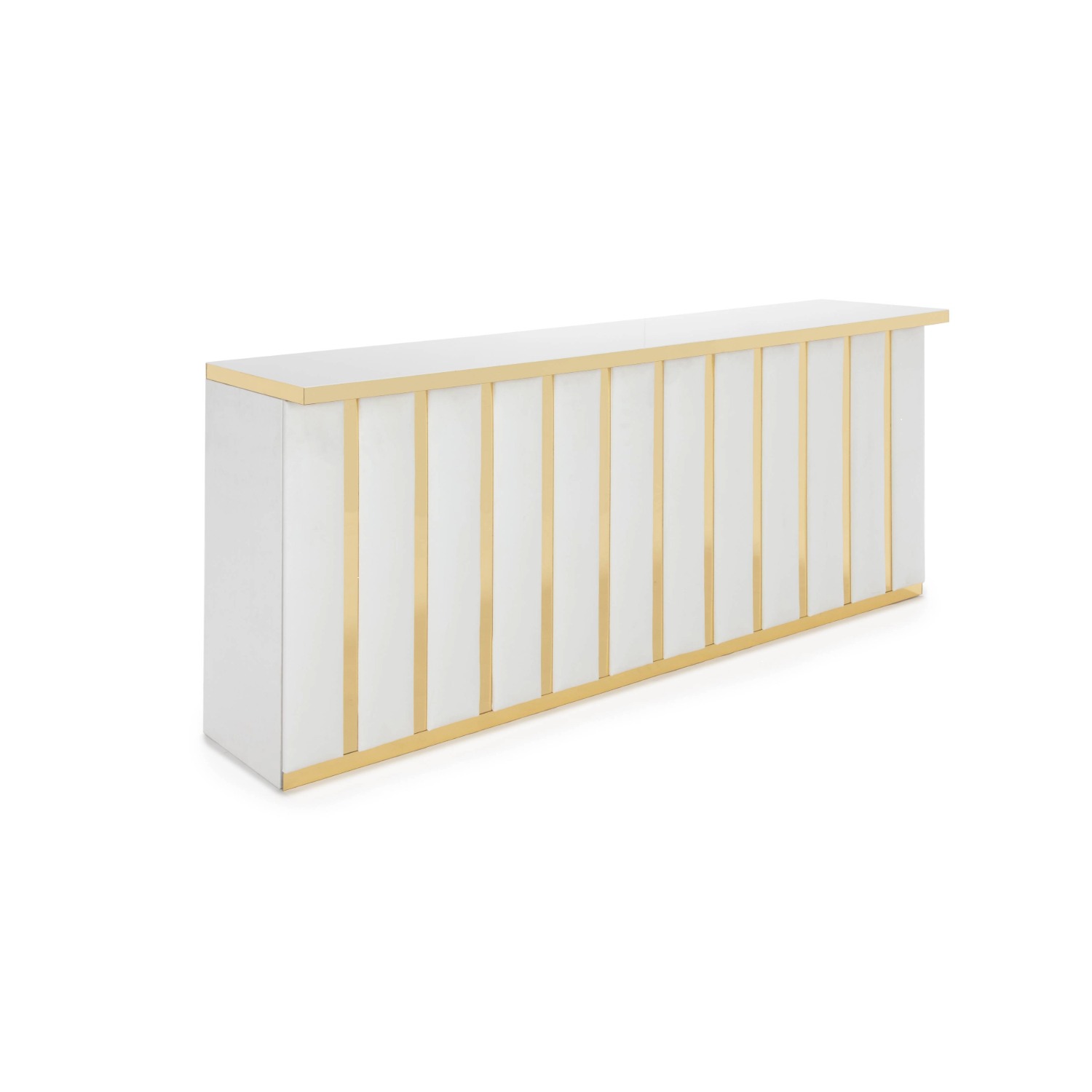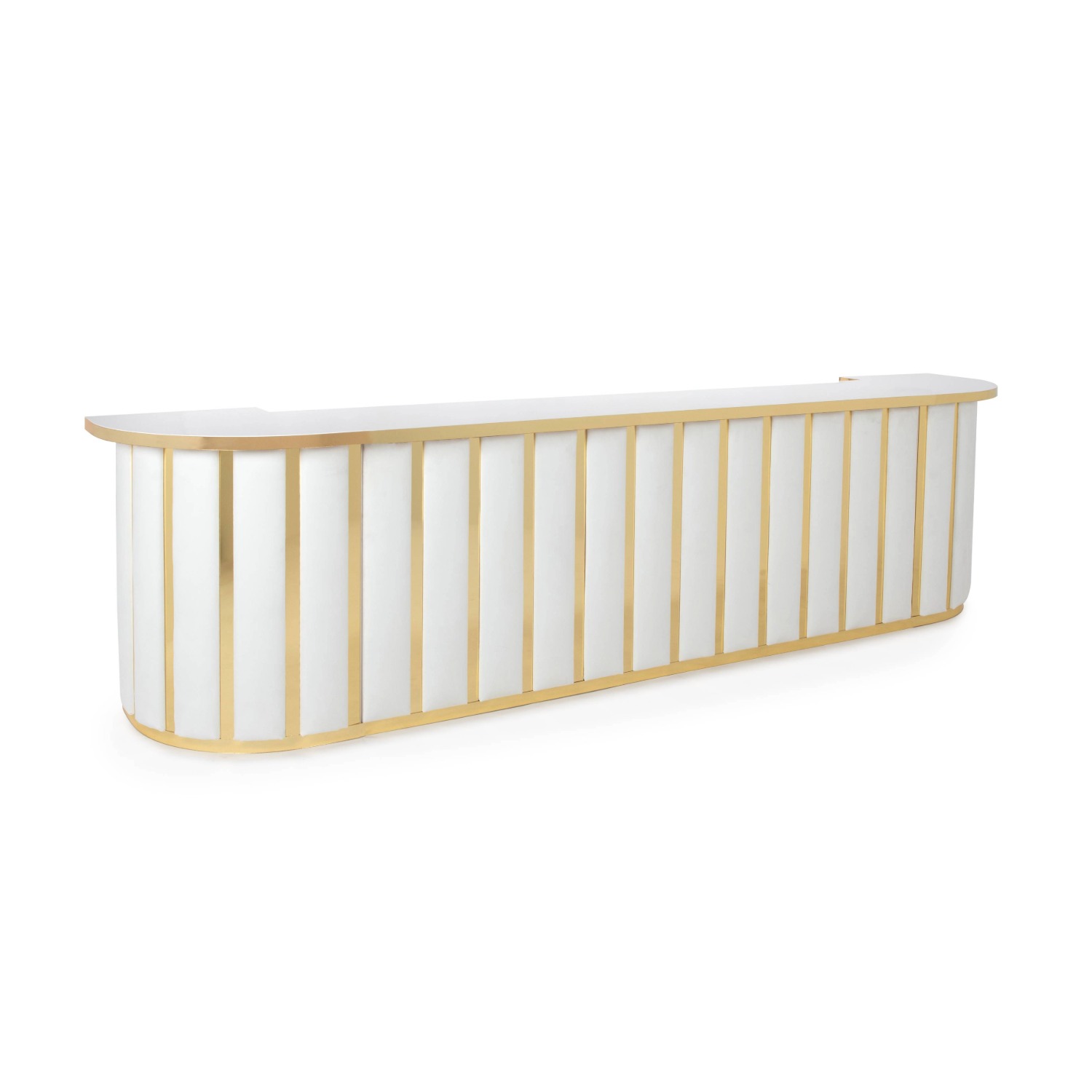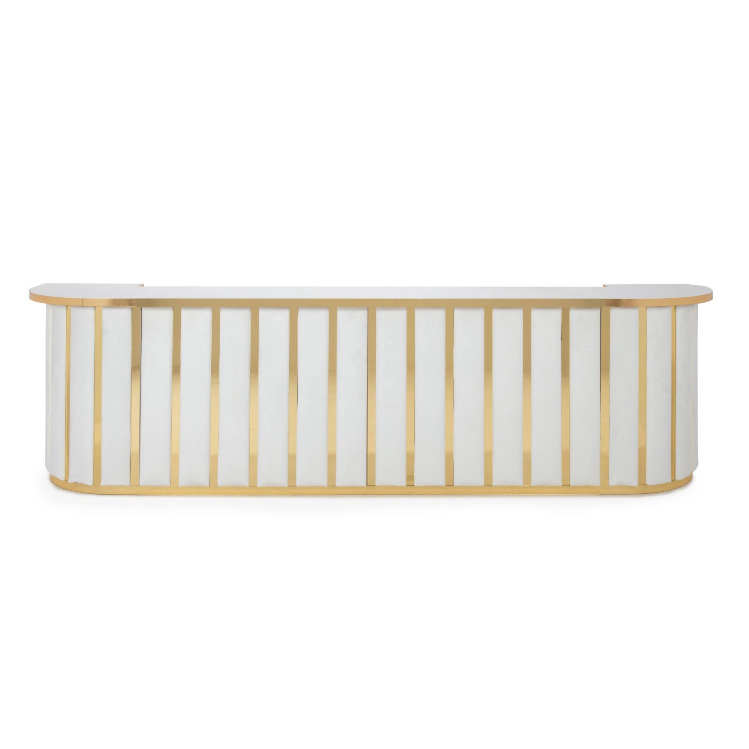 White Velvet Channeled Bar with Gold Mirror Strip Accents with White Acrylic Top with Gold Mirror Edge