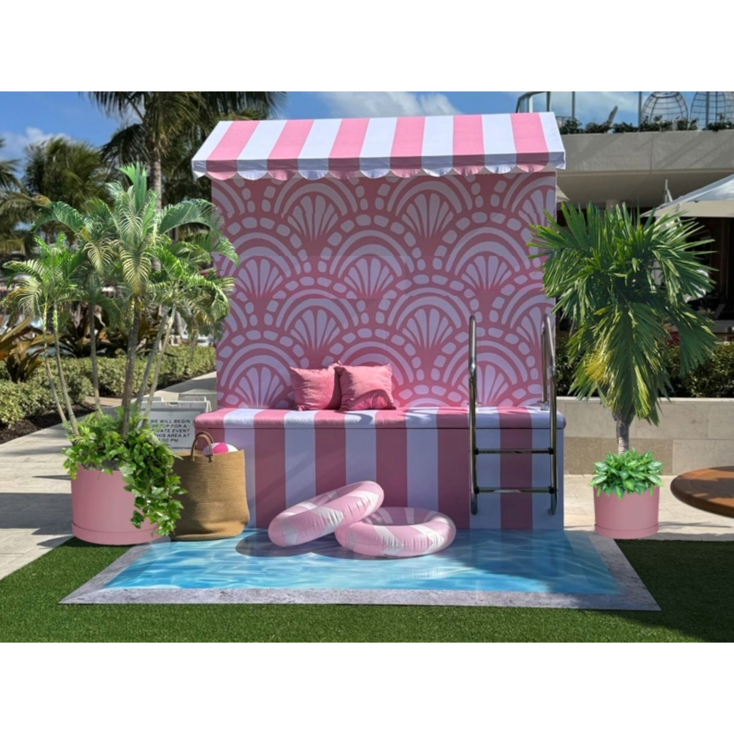 Custom 8ft x 8ft Back Wall Accented with a Pink & White Striped Awning and Bench with Pool Railing and Vinyl Wrapped Flooring to Mimic a Pool. Overall Dimensions are 10ft Wide x 9 1/2 ft Deep x 9 1/2 ft High