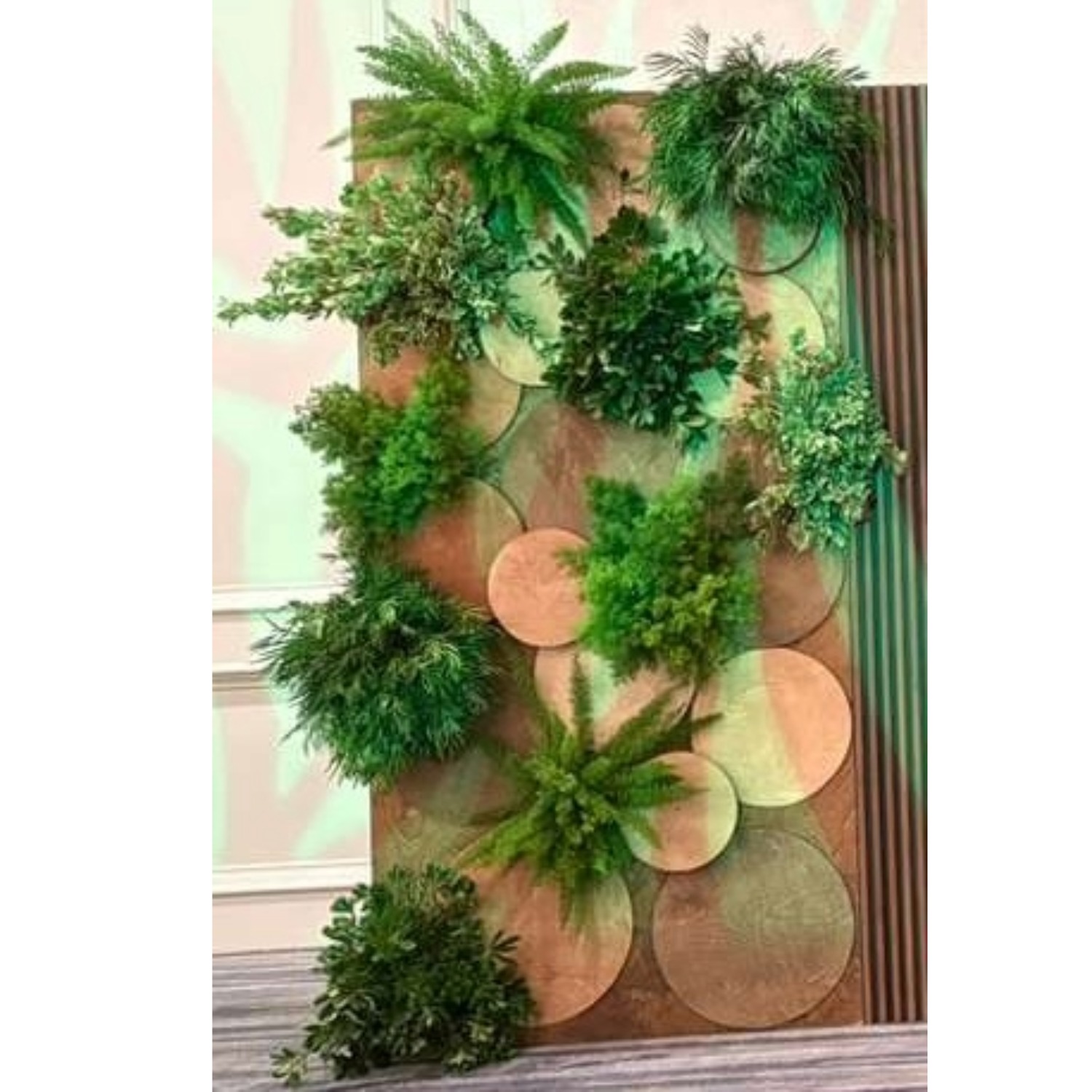Mahogany Wood Wall with Added Disks that get accented with Foliage